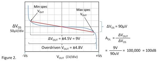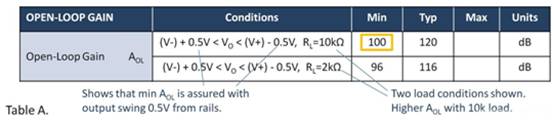 并非所有運算放大器制造商對AOL的規(guī)定都相同。我們的精密運算放大器經(jīng)過開環(huán)增益測試,在一個較大的輸出擺動范圍求其平均值,以實現(xiàn)良好的線性運行(圖2中紅色線條)。它的規(guī)格表如下: