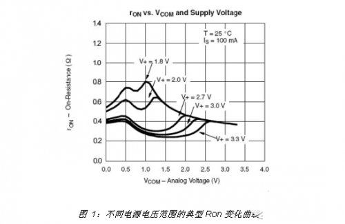 RON會隨著電源電壓的增加而減小。圖1顯示了上海英聯(lián)電子科技有限公司(下文簡稱英聯(lián)電子)的UM4684在不同電源電壓上測得的RON。導(dǎo)通電阻平坦度(RFLAT)即表示RON隨著VIN在0V至VCC或V-至V+)間變化而變化的情況,它是引起THD的主要原因。