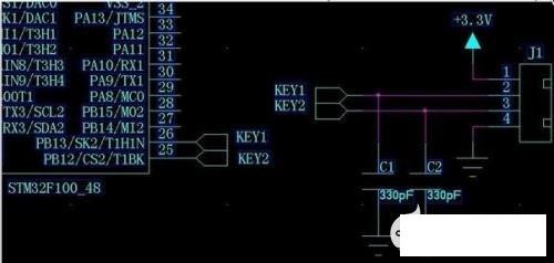 (2)輸入信號線并接小電容。從接口輸入的信號線,最好在靠近接口的地方并接皮法級小電容。電容大小根據(jù)信號的強度以及頻率決定,不能太大,否則影響信號完整性。對于低速的輸入信號,比如按鍵輸入,可以選用330pF的小電容,如圖2.
