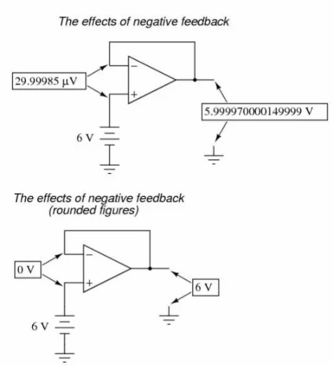 這個(gè)電路很快就會(huì)達(dá)到一個(gè)穩(wěn)定狀態(tài),輸出電壓的幅值會(huì)很準(zhǔn)確的維持運(yùn)放兩個(gè)輸入端之間的壓差,這個(gè)壓差Ve反過來會(huì)產(chǎn)生準(zhǔn)確的運(yùn)放輸出電壓的幅值。將運(yùn)放的輸出與運(yùn)放的反相輸入端連接起來,這樣的方式被稱為負(fù)反饋,這是使系統(tǒng)達(dá)到自穩(wěn)定的關(guān)鍵。這不僅僅適用于運(yùn)放,同樣適用于任何常見的動(dòng)態(tài)系統(tǒng)。這種穩(wěn)定使得運(yùn)放具備工作在線性模式的能力,而不是僅僅處于飽和的狀態(tài),全“開”或者全“關(guān)”,就像它被用于沒有任何負(fù)反饋的比較器一樣。