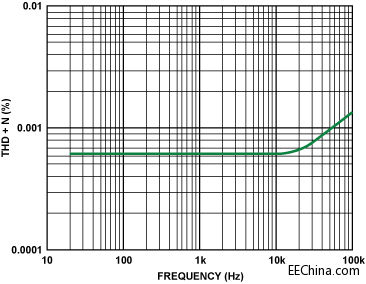 圖2顯示整個(gè)音頻范圍內(nèi)的總諧波失真及噪聲。誤差隨頻率提高而變大,但20 kHz時(shí)總誤差仍然小于0.0007%。圖3給出了該IC的連接圖。