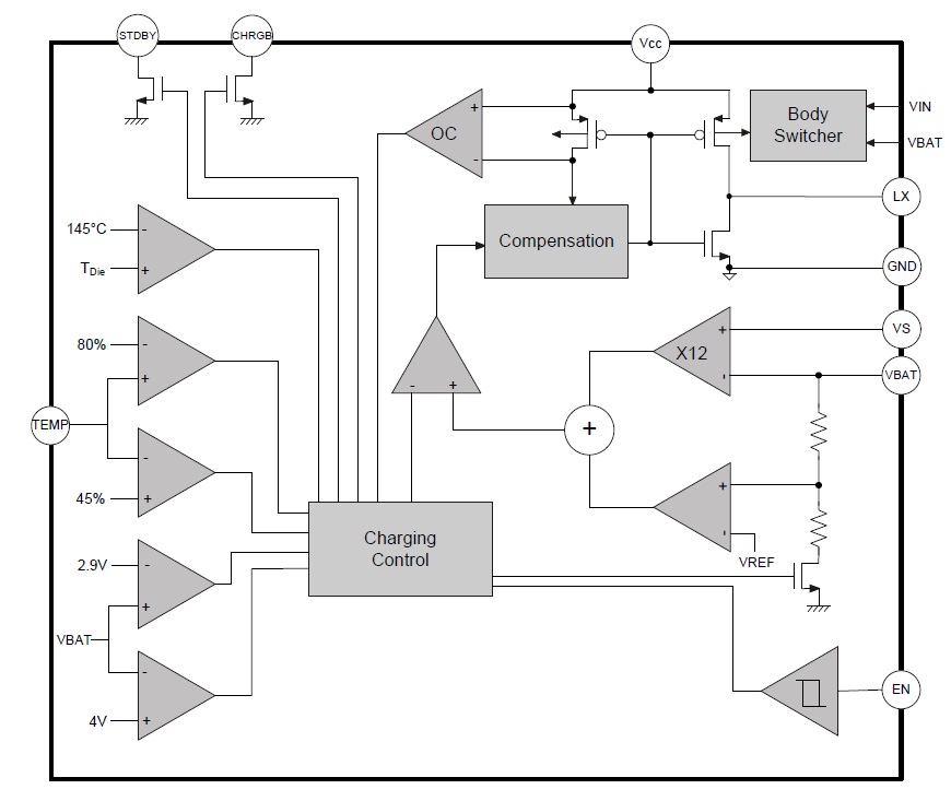 IC 進(jìn)入正常充電時(shí)CHRGB 燈號(hào)會(huì)恆亮,充電截止時(shí)CHRGB 燈號(hào)會(huì)熄滅,當(dāng)電池充飽後又放電至Recharge 電壓4V (約95%的截止電壓),而此時(shí)輸入電源還在的話,CHRGB 燈號(hào)會(huì)再度亮起來(lái),IC 會(huì)開(kāi)始充電直到充電截止,STDBY 燈則相反。