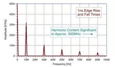 您可以將某個數(shù)字信號的頻譜成分簡化為頻率和上升時間。時鐘或者系統(tǒng)頻率建立電路的時間基準(zhǔn),但其邊緣率形成干擾諧波。圖1顯示了一個10MHz方波的頻譜成分。該10MHz信號的邊緣率為10ns。請注意,圖1中這些諧波的量級隨頻率降低。一般而言,這種信號的潛在EMI為: