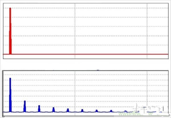 讓我們假設(shè)我們有一個由完美的5 kHz正弦波組成的音頻信號。我們知道時域中的正弦波是什么樣的,在頻域中我們只能看到5 kHz的頻率“尖峰”,F(xiàn)在讓我們假設(shè)我們激活一個500 kHz振蕩器,將高頻噪聲引入音頻信號。在示波器上看到的信號仍然只是一個電壓序列,每個時刻有一個值,但信號看起來會有所不同,因為它的時域變化現(xiàn)在必須反映5 kHz正弦波和高頻噪音波動。然而,在頻域中,正弦波和噪聲是在該一個信號中同時存在的單獨的頻率分量。正弦波和噪聲占據(jù)了信號頻域表示的不同部分(如下圖所示),這意味著我們可以通過將信號引導(dǎo)通過低頻并阻擋高頻的電路來濾除噪聲。