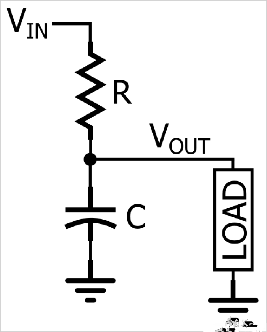 如圖所示,通過將一個電阻與信號路徑串聯(lián),并將一個電容與負(fù)載并聯(lián), 可以產(chǎn)生RC低通響應(yīng)。在圖中,負(fù)載是單個組件,但在實際電路中,它可能更復(fù)雜,例如模擬到數(shù)字轉(zhuǎn)換器,放大器或示波器的輸入級,用于測量濾波器的響應(yīng)。