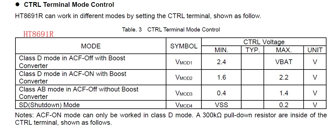比如:都工作在防破音模式,HT8691是1.1V左右,HT8691R是2V左右。4. 放大倍數(shù)(增益)設置區(qū)別: