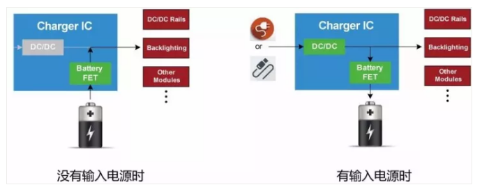 充電IC是基于電池和系統(tǒng)負(fù)載之間的連接方式的不同,系統(tǒng)負(fù)載可以由輸入電源供電,也可以由電池供電,或者由兩者同時(shí)供電。那么電池IC就必須具備功率管理功能,來實(shí)現(xiàn)系統(tǒng)負(fù)載功率來源的選擇。