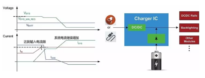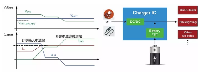 在以上的充電過程中,當(dāng)總的系統(tǒng)負(fù)載需求超過輸入電源的能力時(shí),系統(tǒng)母線電壓會下跌,充電IC就會減少充電電流以保證總的負(fù)載功率不再繼續(xù)增加,從而穩(wěn)定系統(tǒng)電壓不再下跌,維持系統(tǒng)負(fù)載的平穩(wěn)運(yùn)行。