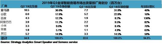 2019年Q3亞馬遜Echo智能音箱出貨量為1050萬,這是該公司有史以來單季度第二高的出貨量,再次擴(kuò)大了其領(lǐng)先優(yōu)勢。2019年Q3全球智能音箱出貨量同比增長55%,達(dá)到3490萬臺(tái),其中中國廠商百度、阿里巴巴和小米的銷量均高于平均增長。