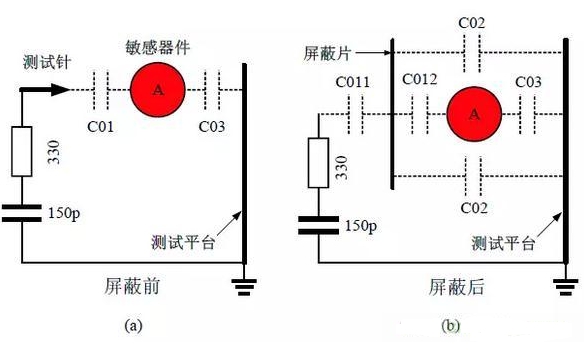 這里需要特別說明的是,對ESD進(jìn)行靜電屏蔽防護(hù)的金屬屏蔽片是可以不需要接地的。經(jīng)屏蔽之后,在屏蔽片與大地之間就會增加一個分布電容C02,C02對C011 在C012、C03 產(chǎn)生的電壓起到分壓作用,因此,C02 與C012、C03 之比,越大越好,而C01=C011+C012=2C012(假說C011=C012)。加大C02 要盡量加大屏蔽片的有效面積,而減小C01,則應(yīng)該盡量讓A 遠(yuǎn)離測試探頭和機(jī)殼,并把敏感器件A 置于公共地的包圍圈之中。金屬屏蔽片一般選用如過濾嘴香煙包裝盒中的錫箔片最為簡便。