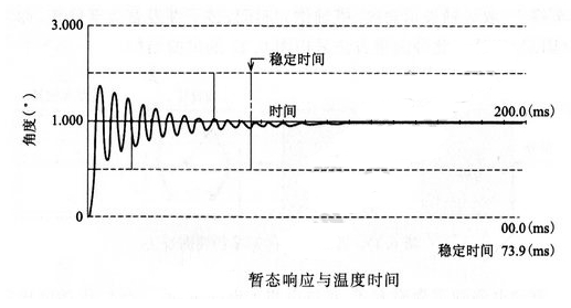 測(cè)量暫態(tài)特性,縱軸的角度精度要更精確的獲取,電位計(jì)用編碼器來(lái)代替,其穩(wěn)定波形可以用打印機(jī)輸出。下圖為此測(cè)量方法的穩(wěn)定波形,有兩次衰減振蕩即到達(dá)停止角度的±5%內(nèi),即到1.8°±5%讀取穩(wěn)定時(shí)間(setting TIme)。