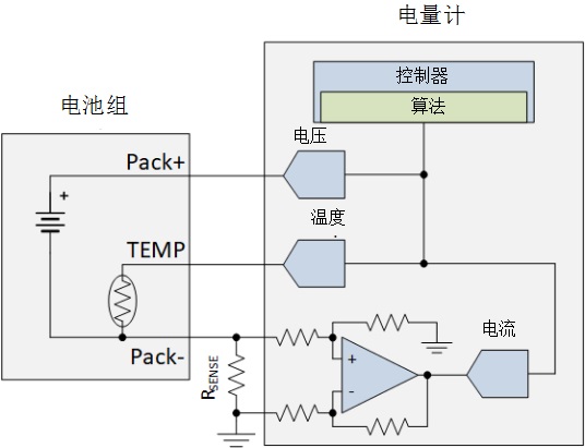 圖1:帶外部電流檢測放大器和控制器測量的電量計