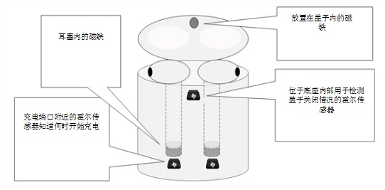 霍爾效應(yīng)傳感器能夠很好地應(yīng)用于檢測充電盒蓋和耳塞充電情況。鑒于磁鐵已用來合上充電盒蓋,因此,以霍爾效應(yīng)開關(guān)的形式使用磁感測解決方案檢測蓋子顯然是一種無需額外零件即可之際連接/斷開藍牙的解決方案。此外,將磁鐵放進在耳塞,是一種能夠檢測充電盒內(nèi)是否存在耳塞的從而有效充電方法。