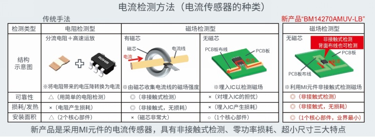 以往采用霍爾元件的產(chǎn)品,如果不在電流傳感器內(nèi)布設(shè)電流線,就無法檢測電流,而布線則會產(chǎn)生損耗、發(fā)熱問題,萬一電流傳感器損壞,可能會導致整個系統(tǒng)停動。而ROHM新產(chǎn)品利用MI元件的高靈敏度特性,能以非接觸方式檢測電流,即使在使用高電壓的應用中,也不會發(fā)生額外的損耗和發(fā)熱問題,并且無需絕緣,設(shè)計更簡潔,有助于提高系統(tǒng)的可靠性。