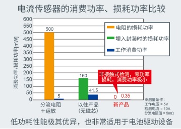 以往的產(chǎn)品,霍爾元件本身的消費電流就很大,因此當作為電流傳感器產(chǎn)品使用時,會產(chǎn)生10mA左右的消費電流。而新產(chǎn)品利用MI元件的低消費電流特性,實現(xiàn)了超低工作消費電流0.07mA(5V工作時的消費功率0.35mW),與以往產(chǎn)品相比,消費電流僅為1/100。此外,相比以往6.0mm x 4.9mm的尺寸,新產(chǎn)品僅3.5mm見方,業(yè)界最小的消費電流加上超小尺寸,非常適用于電池驅(qū)動設(shè)備。