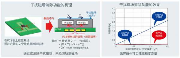 以往產(chǎn)品會因受地磁等干擾磁場的影響而產(chǎn)生測量誤差,需要采用磁屏蔽措施來屏蔽干擾。而ROHM的新產(chǎn)品,安裝在PCB板的往復布線上,利用內(nèi)部的雙感應單元即可消除產(chǎn)生噪聲的干擾磁場,僅會檢測到原本需要測量的電流產(chǎn)生的磁場,因此無需屏蔽即可實現(xiàn)高精度測量。