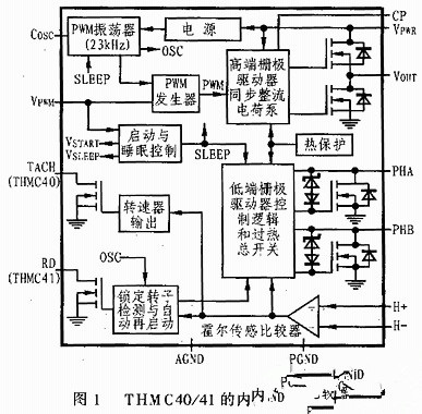 THMC40/41驅(qū)動(dòng)器內(nèi)部由23kHz PWM振蕩器、PWM產(chǎn)生器、轉(zhuǎn)速器、高端柵極驅(qū)動(dòng)器、低端柵極驅(qū)動(dòng)器、霍爾傳感比較器、啟動(dòng)和睡眠檢測電路、鎖定轉(zhuǎn)子檢測與自動(dòng)再啟動(dòng)電路、熱管理電路、高低端開關(guān)、同步開關(guān)電路以及電源電路等部分構(gòu)成,圖1所示其內(nèi)部結(jié)構(gòu)框圖。