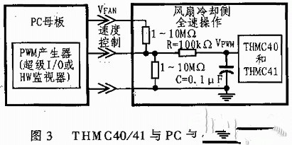 將THMC40/41的腳5(VOUT)高端驅(qū)動(dòng)輸出施加于電機(jī)繞組的公共端L,即可利用芯片內(nèi)部產(chǎn)生的PWM信號(hào)可為電機(jī)提供一個(gè)可控制的功率,從而控制電機(jī)的轉(zhuǎn)速。當(dāng)PWM驅(qū)動(dòng)信號(hào)開通期間,電機(jī)電流增加;在PWM驅(qū)動(dòng)信號(hào)截止期間,電機(jī)電流減小。在THMC40/41腳14(VPWM)上的速率控制輸入開路時(shí),可由1~10MΩ電阻控制風(fēng)扇運(yùn)行。利用VPWM電壓可以決定VOUT上輸出的PWM波形占空因數(shù),VPWM既可以是直流控制電壓輸入,亦可以是數(shù)字控制輸入。將VPWM電壓和腳1(Cosc)上產(chǎn)生的三角波電壓進(jìn)行比較,從而使芯片內(nèi)部PWM比較器的輸出占空因數(shù)與電壓VPWM成正比。當(dāng)腳14上的電壓VPW《0.7V時(shí),THMC40/41處于睡眠狀態(tài);當(dāng)VPWM在0.7~2.5V之間變化時(shí),其PWM占空比也將在11%~100%范圍內(nèi)作相應(yīng)改變,從而使電扇風(fēng)速隨之變化。