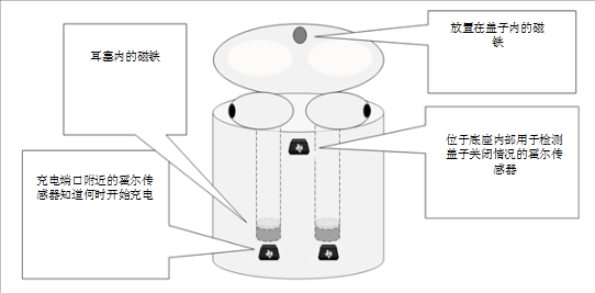 霍爾效應(yīng)傳感器能夠很好地應(yīng)用于檢測充電盒蓋和耳塞充電情況。鑒于磁鐵已用來合上充電盒蓋,因此,以霍爾效應(yīng)開關(guān)的形式使用磁感測解決方案檢測蓋子顯然是一種無需額外零件即可之際連接/斷開藍牙的解決方案。此外,將磁鐵放進在耳塞,是一種能夠檢測充電盒內(nèi)是否存在耳塞的從而有效充電方法。