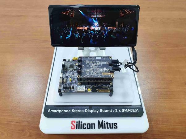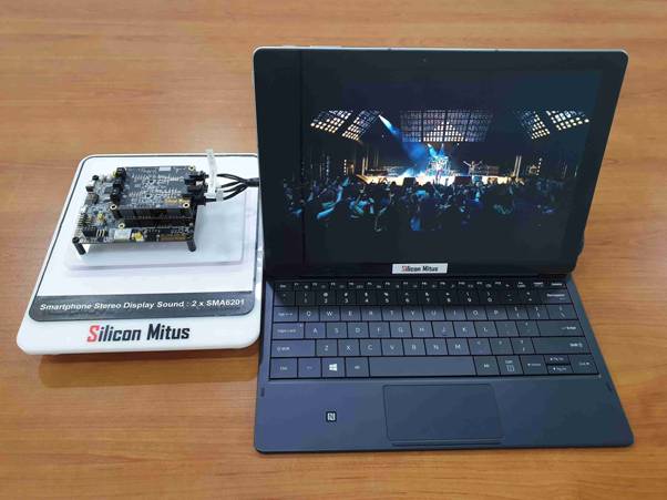 除此之外,在現(xiàn)場還可以欣賞與屏幕發(fā)聲完美結(jié)合的壓電陶瓷驅(qū)動芯片(Piezo Driver),也就是Silicon Mitus的SMA6201產(chǎn)品。這款產(chǎn)品可適用于智能手機、平板、筆記本和臺式電腦。通過在顯示面板上引起的細微震動,全屏可自發(fā)聲。