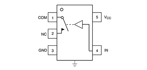 模擬開關(guān)使用并行的 P 溝道 MOSFET 與 N 溝道 MOSFET 來創(chuàng)建雙向開關(guān)。ON Semiconductor 的 NS5B1G384 SPST 常閉模擬開關(guān)便是一個(gè)簡單的 CMOS 模擬開關(guān)示例(圖 1)?刂戚斎敫鶕(jù)器件配置是常開 (NO) 還是常閉 (NC),將適當(dāng)?shù)哪孀兒头悄孀冃盘柊l(fā)送到 MOSFET 柵極。