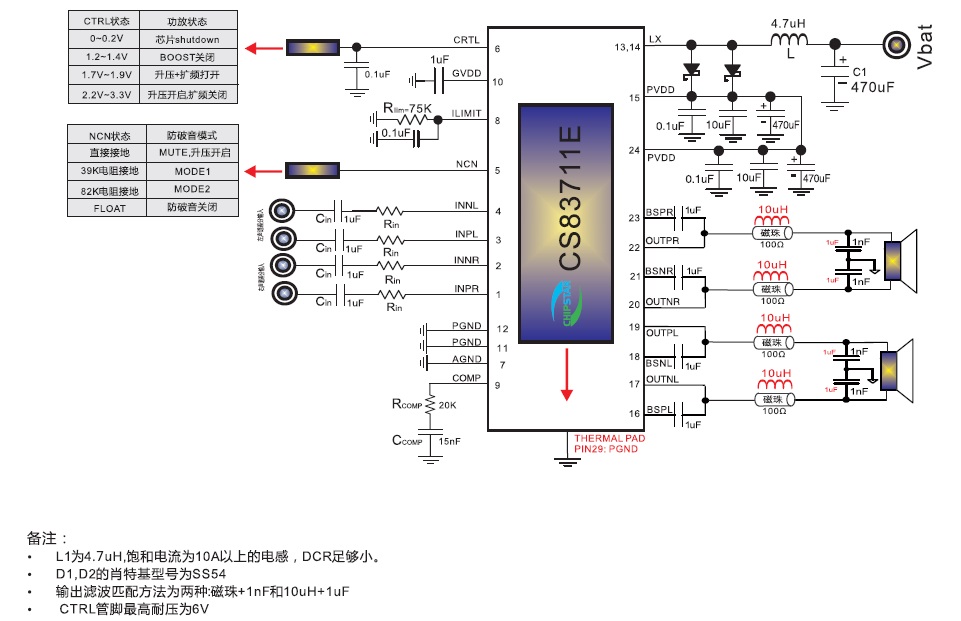 CS83711E的全差分架構(gòu)和極高的PSRR有效地提高了CS83711E對RF噪聲的抑制能力。無需濾波器的PWM調(diào)制結(jié)構(gòu)及內(nèi)置的BOOST升壓模塊,以及CS83711E采用專有的AERC(Adaptive Edge Rate Control)技術(shù) ,在音頻全帶寬范圍內(nèi)極大地降低了EMI的干擾,對60cm的音頻線,在FCC的標準下具有超過20dB的裕量,另外CS83711E內(nèi)置了過流保 護,短路保護和過熱保護,有效的保護芯片在異常的工作條件下不被損壞。