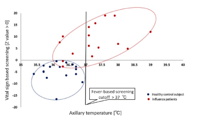 由下圖可見(jiàn),傳統(tǒng)的單純體溫檢測(cè)法(大于37°截止閾值),二象限內(nèi)的樣本都會(huì)被遺漏掉,會(huì)存在大量的漏檢。