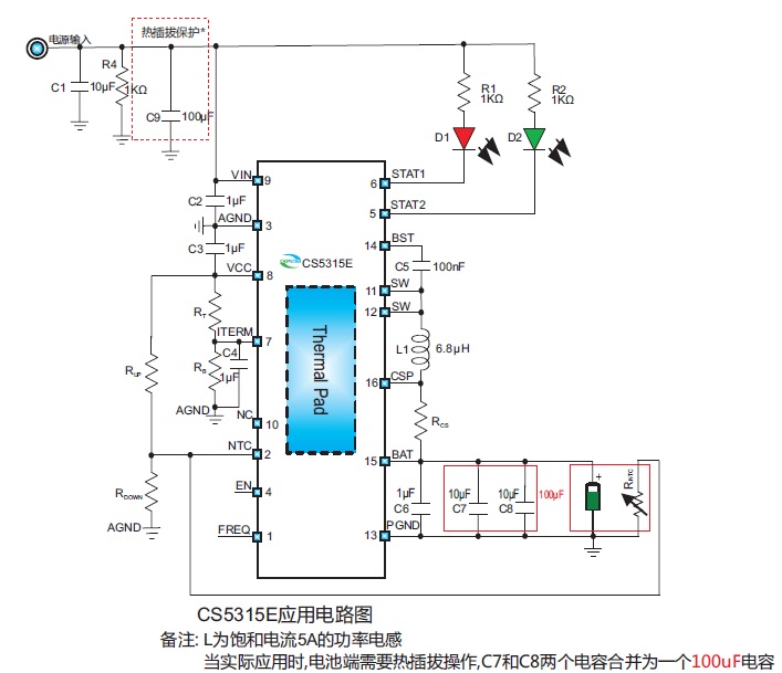 CS5315E具有完善的保護(hù)功能,包括輸入欠壓和過壓保護(hù)、電池過壓和短路保護(hù)、電池溫度保護(hù)、芯片溫度 調(diào)節(jié)和保護(hù),同時(shí)還具備電池反接保護(hù)功能。此外芯片通過外接的兩路LED指示燈,可對(duì)充電過程實(shí)現(xiàn)全程監(jiān)控。
