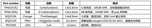 與充電盒的設計相比,耳機端的空間更小,對芯片的封裝和功耗提出了更嚴格的要求。針對這種情況,TI在耳機端的方案匯總?cè)缦拢?/font>