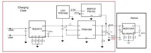 TI有一份針對TWS耳機的參考設計TIDA-050007,下圖是參考設計的系統(tǒng)框圖。這個參考設計整機功耗只有18uA,并且采用簡易算法實現(xiàn)升壓的動態(tài)調(diào)節(jié),在充電盒電池電壓高于耳機電池電壓時升壓芯片TPS61099還可以進入直通模式,使充電效率進一步提高。