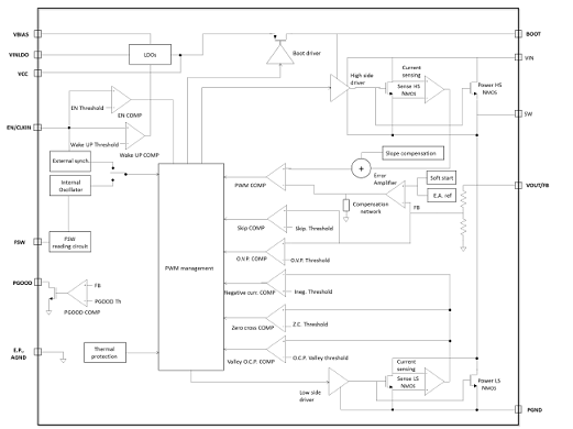 The L6983 allows switching frequency selection between 200 Hz and 2.2 MHz with optional spread spectrum for improved EMC. The EN pin provides enable/disable function. The typical shutdown current is 2 μA when disabled. When the EN pin is pulled up, the device is enabled and the internal 1.3 ms soft-start takes place. The device features power good open collector that monitors the FB voltage. Pulse-bypulse