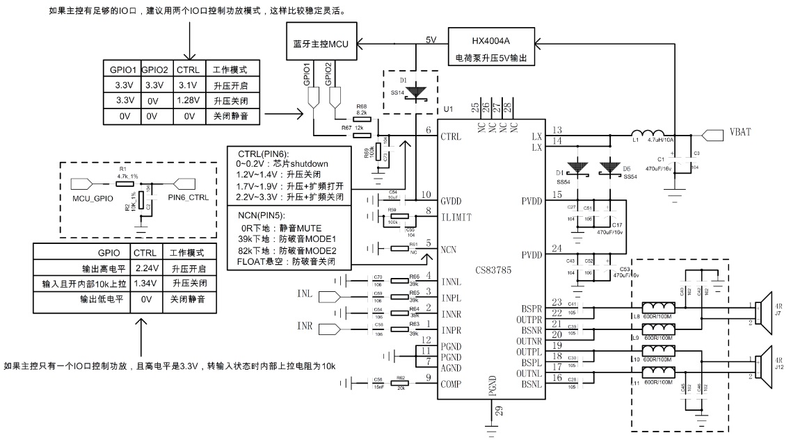 1.針對FM收音模式,CS83785可以考慮把升壓關(guān)閉,Pin6(CTRL)管腳設(shè)置電壓為:1.2V~1.4V。