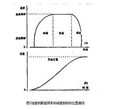 因為步進電機系統(tǒng)的啟動頻率比它的最高運行頻率低得多,因此,為了減少定位時間,常常通過加速使電機在接近最高的速度下運行。隨著目標位置的逼近,為使電機平穩(wěn)地停下來,重新使步進頻率逐漸降低到啟停電機頻率。從初始位置往目標位置運動的整個過程中,步進頻率都在變。若以曲線表示即得“速度曲線”,如圖3所示。注意;減速可以比加速快得多,因為負載轉(zhuǎn)矩幫助系統(tǒng)制動;而且,電機產(chǎn)生的減速轉(zhuǎn)矩比 (a)速度曲線;(b)對應(yīng)的位置/時間響應(yīng)曲線加速轉(zhuǎn)矩大。