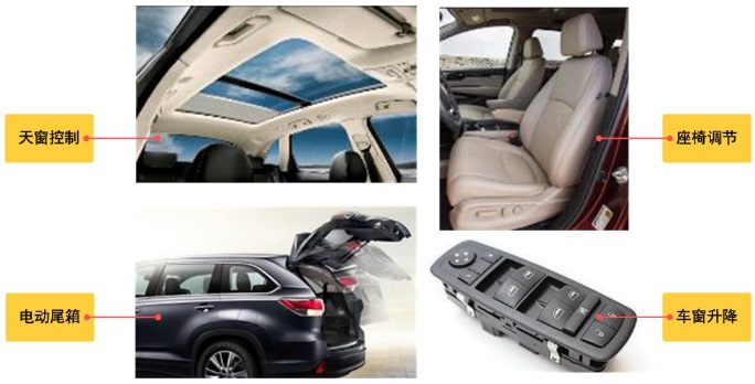 電機在汽車上的應用,讓汽車實現(xiàn)自動化,加強駕駛安全性以及舒適性。不同類型的電機因各自的特點而被應用到汽車上不同的功能模塊,有刷直流電機同樣也在汽車的多個功能模塊中用到,如下圖所示。