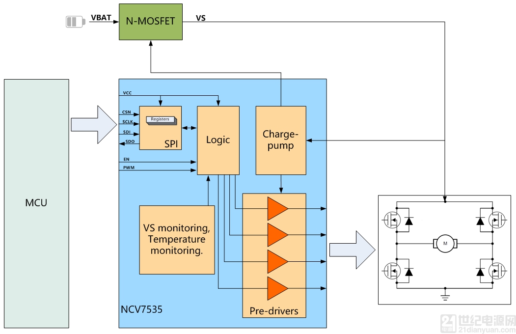 安森美推出的NCV7535是功能增強型的H橋驅動芯片,可通過SPI接口對其進行配置,可提供N-MOS防反接電路設計電荷泵,支持多種保護機制,是一款高集成度的汽車等級的芯片,芯片框架如下圖所示。