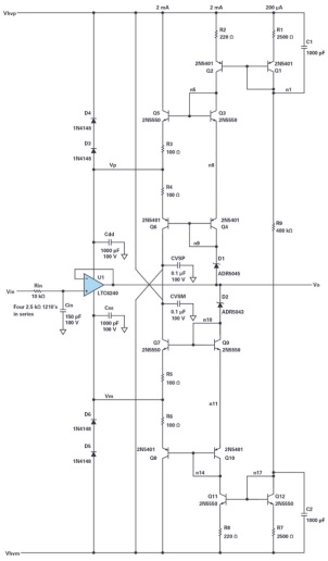 LTC6240系列提供0.25 pA偏置電流(典型值)和0.55μV p-p低頻噪聲。這對于輸入緩沖器來說已經(jīng)足夠好了,但該器件僅支持最高12 V的電源。我們將不得不在放大器周圍添加電路以使其適應(yīng)更高的電壓。