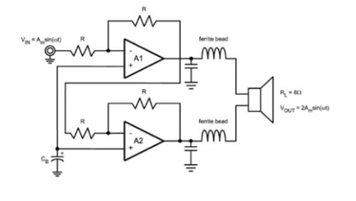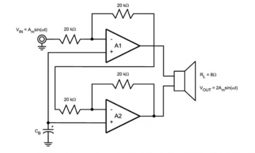 在該結(jié)構(gòu)(圖 1)中,一個輸入信號 VIN 加到放大器 A1 的反相輸入端并通過增益為 0dB 的放大。A1 的輸出連接到揚聲器的一側(cè)和放大器 A2 的反相輸入端,同樣經(jīng)過 0dB 增益放大。A2 的輸出連接到揚聲器的另一端。因為 A2 的輸出同 A1 的輸出是 180 度反相的,A1 和 A2 之間的最終差值 VOUT,是單個放大器輸出幅值的兩倍。當給定正弦輸入信號, 比較單端放大器,該 BTL 結(jié)構(gòu)有效地加倍輸出電壓,使得在相同負載下輸出功率增加為原來的四倍(圖 2)。
