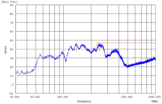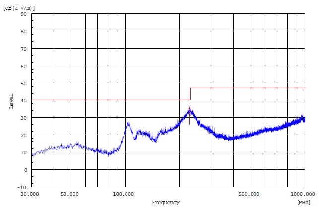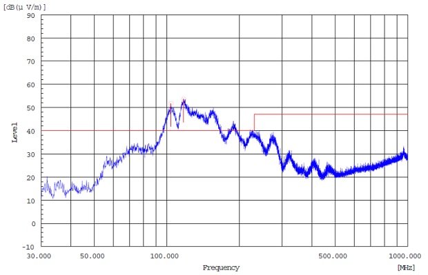 HT360使用Demo板12V供電、輸出接2個(gè)4ohm喇叭,喇叭線長(zhǎng)度約10cm, 輸出接了330R@100MHz磁珠和下地的1nF電容,使用1kHz信號(hào)輸出2*15W時(shí),測(cè)得的輻射曲線如下圖(取輻射嚴(yán)重的方向)。