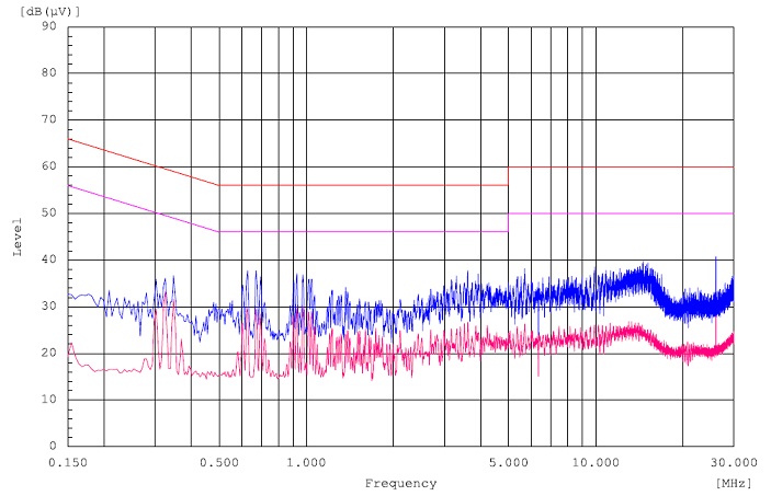 另外,HT360具有擴(kuò)頻功能,可輕松通過(guò)傳導(dǎo)認(rèn)證。使用Demo 板,12V 適配器供電、輸出接2個(gè)4ohm喇叭,喇叭線長(zhǎng)度約10cm, 輸出接了330R@100MHz 磁珠和下地的1nF電容,使用1kHz信號(hào)輸出2*15W時(shí),測(cè)得的傳導(dǎo)曲線如下圖(取輻射嚴(yán)重的方向)。