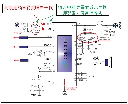 (3). 音頻信號(hào)輸入采樣電阻盡量靠近功放芯片管腳放置。