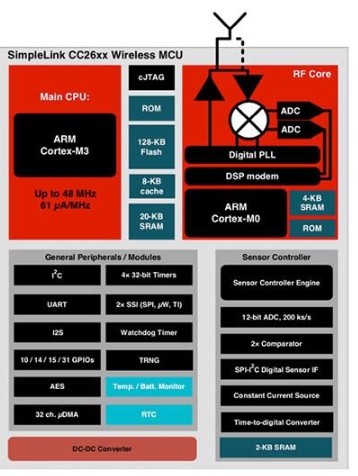 圖 1:Texas Instruments 的 CC2640R2F BLE 器件等高級(jí)無線微控制器,通過使用 Arm Cortex-M0 節(jié)能型處理器內(nèi)核來保持無線連接,同時(shí)使 Arm Cortex-M3 主處理器處于休眠狀態(tài),以此實(shí)現(xiàn)最佳的功耗。(圖片來源:Texas Instruments)