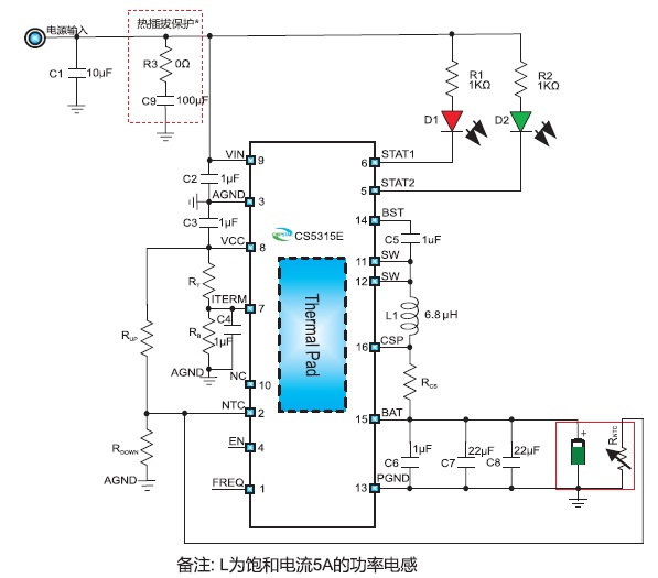CS5315E具有完善的保護(hù)功能,包括輸入欠壓和過壓保護(hù)、電池過壓和短路保護(hù)、電池溫度保護(hù)、芯片溫度 調(diào)節(jié)和保護(hù),同時還具備電池反接保護(hù)功能。此外芯片通過外接的兩路LED指示燈,可對充電過程實(shí)現(xiàn)全程監(jiān)控。