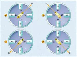 現(xiàn)在假設我們構(gòu)造一個定子上纏繞有兩個繞組的電機,內(nèi)置一個能夠繞中心任意轉(zhuǎn)動的永久磁鐵,這個可旋轉(zhuǎn)部分叫做轉(zhuǎn)子。圖2給出了一種簡單的電機,叫做雙相雙極電機,因為其定子上有兩個繞組,而且其轉(zhuǎn)子有兩個磁極。如果我們按圖2a所示方向給繞組1輸送電流,而繞組2中沒有電流流過,那么電機轉(zhuǎn)子的南極就會自然地按圖中所示,指向定子磁場的北極。