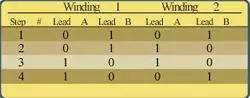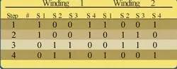 首先,要給腳1B和2B施加一個正電壓,并將1A和2A接地。然后,給腳1B和2A施加一個正電壓,而將1A和2B接地,這一過程其實取決于導線繞齒槽纏繞的方向,假設導線纏繞的方向與上一節(jié)所述相符。依次進行下去,我們就得到了表1中總結(jié)的激勵順序,其中,“1”表示正電壓,“0”表示接地。