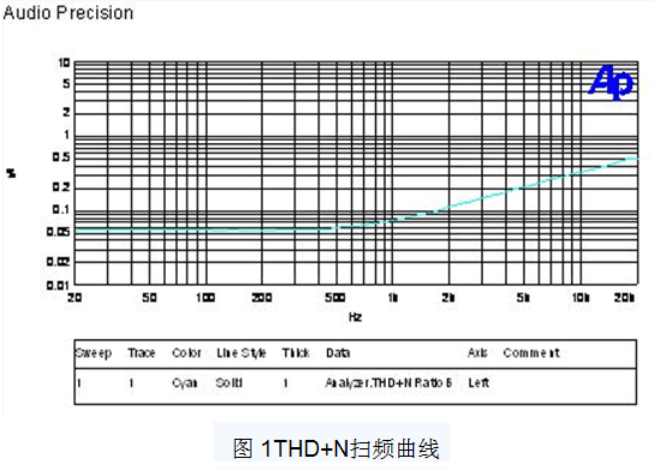 對于音響和高端手機用戶來說,THD+N體現了音頻功放的失真度,是非常重要的指標。為了完整地考察音頻功放在整個音域內的表現,圖 1所示的掃頻曲線也是非常重要的,根據音頻放大器和揚聲器的特性在外圍電路做適當的調整,可以得到令人滿意的音色。