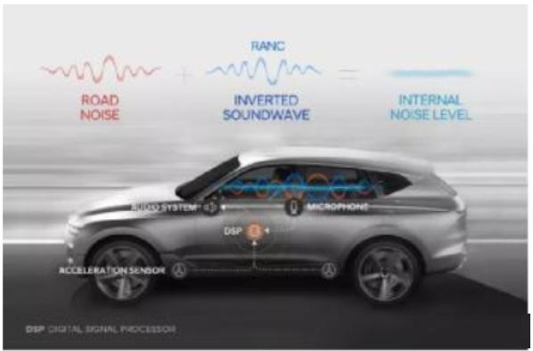 近日,ADI與現(xiàn)代汽車(chē)公司合作推出業(yè)界首個(gè)全數(shù)字路噪降噪系統(tǒng),是首個(gè)可在汽車(chē)車(chē)艙內(nèi)大幅降噪的系統(tǒng),利用了ADI領(lǐng)先的A²B音頻總線技術(shù)幫助解決電子RANC(路噪主動(dòng)噪聲控制)系統(tǒng)面臨的多項(xiàng)挑戰(zhàn)。該RANC系統(tǒng)基于現(xiàn)有的ANC技術(shù),并在此基礎(chǔ)上借助A2B總線優(yōu)化了功能與信號(hào)傳輸?shù)乃俣取R话闾ピ牖虬l(fā)動(dòng)機(jī)噪音0.009秒左右就能進(jìn)入駕駛艙內(nèi),基于A2B可以保證延時(shí)最多2個(gè)時(shí)鐘周期(50Mbps),由于其計(jì)算和信號(hào)傳輸速度得到了優(yōu)化,因此僅需 0.002 秒即可分析噪聲并產(chǎn)生由數(shù)字信號(hào)處理器(DSP)產(chǎn)生的反向聲波,這對(duì)于過(guò)去的傳統(tǒng)總線來(lái)說(shuō)是一個(gè)挑戰(zhàn)。RANC能夠通過(guò)特殊的信號(hào)與傳感器位置在車(chē)輛行駛時(shí)對(duì)車(chē)內(nèi)前后排產(chǎn)生的噪音進(jìn)行精確的分析與計(jì)算,并可將車(chē)內(nèi)噪音降低3dBA,這也是RANC技術(shù)的核心所在——不要小看3dBA,在聲壓領(lǐng)域,3dBA相當(dāng)于將噪音減少一半。