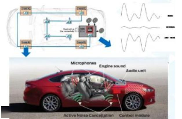 目前三維空間主動(dòng)降噪技術(shù)應(yīng)用,比較成熟的是在對(duì)汽車(chē)引擎的降噪上,但由于引擎噪音固定且低頻,降噪相對(duì)易行,一般來(lái)說(shuō),車(chē)輛行駛時(shí)除了主要有來(lái)自于發(fā)動(dòng)機(jī)的噪音外,還有包括胎噪、風(fēng)噪以及外界環(huán)境的噪音等,F(xiàn)階段汽車(chē)則是主要是通過(guò)減振、消音、隔音這幾種比較傳統(tǒng)的技術(shù)來(lái)進(jìn)行降噪,更進(jìn)一步的技術(shù)則是采用ANC車(chē)內(nèi)主動(dòng)降噪科技。需要依靠軟件來(lái)驅(qū)動(dòng),然后使用車(chē)內(nèi)麥克風(fēng)噪音樣本進(jìn)行采集,經(jīng)系統(tǒng)分析出噪音的頻譜后,再由車(chē)內(nèi)揚(yáng)聲器播放與噪音相位相反、振幅相同的聲波來(lái)達(dá)到抵消噪音的目的。
