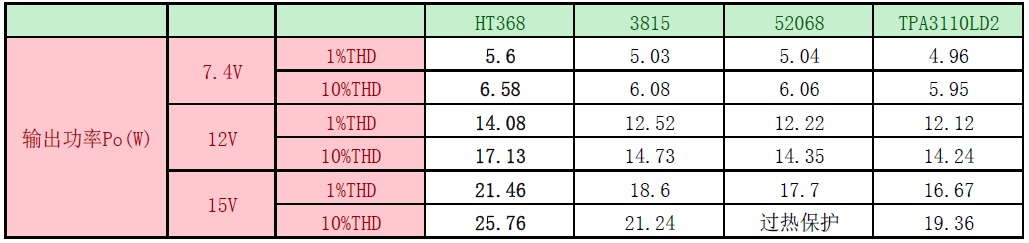 1.HT368輸出功率最大,PVCC=15V, 3815,52068,TPA3110LD2都容易過(guò)熱保護(hù)。