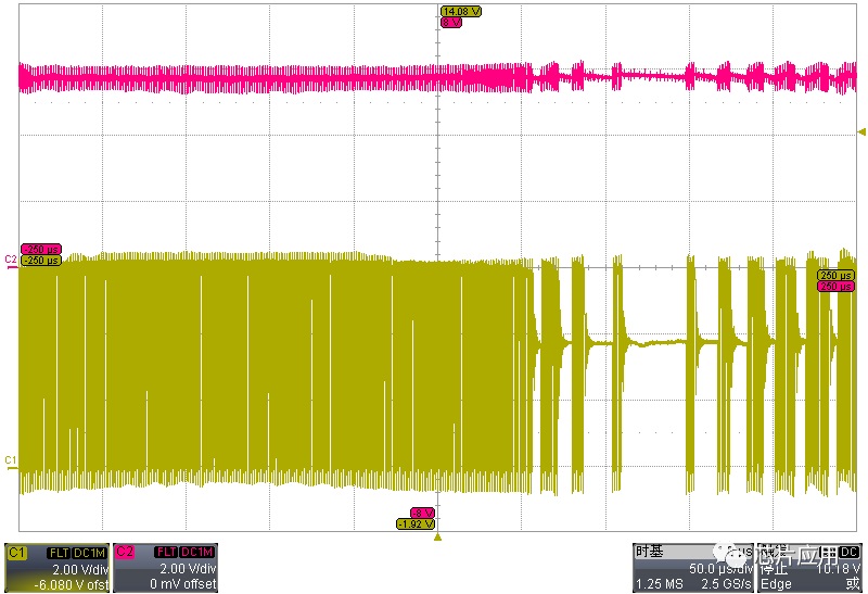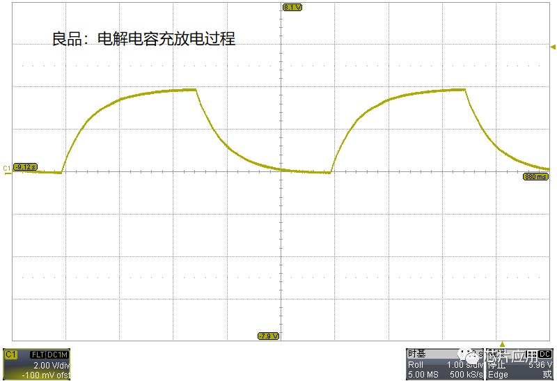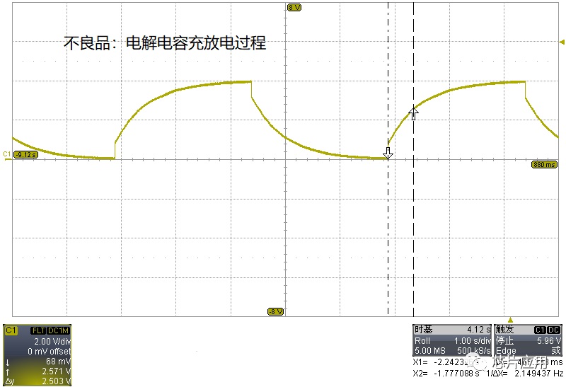 一個RC的時間是465ms,所以容量是對的。但是重點來了,電容充電的起始點發(fā)現(xiàn)異常,不是從0開始,而是有一個固定的電壓。這個極有可能是電解電容已經(jīng)損壞,或者內(nèi)部寄生阻抗太大,甚至達(dá)到了100歐的級別,導(dǎo)致環(huán)路出現(xiàn)了不穩(wěn)定,震蕩。