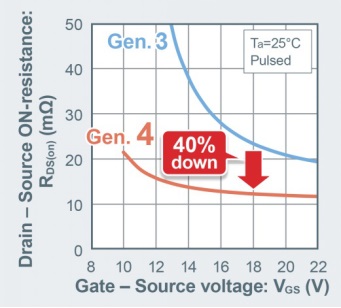 此次,通過進一步改善ROHM獨有的雙溝槽結構,在不犧牲短路耐受時間的前提下,成功地使導通電阻比以往產品降低約40%。